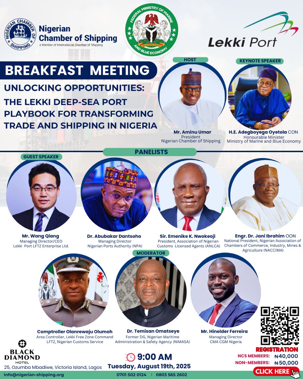 Join us 9:00am on Tuesday, August 19th, at Black Diamond Hotel, Victoria Island, Lagos, as we welcome the Honourable Minister of Marine and Blue Economy, H.E. Adegboyega Oyetola CON, and Lekki Port’s CEO, Mr. Wang Qiang.